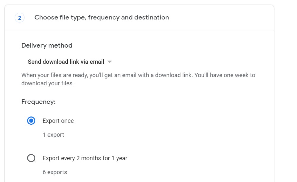 Downloading your emails to an external hard drive is an easy process as discussed in the article above. Navigate to the takeout.google.com link. Select the “send a download link via email” option i.e. your chosen delivery method.