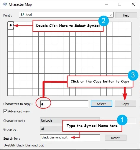 - The symbol you searched for (diamond symbol) will now appear on the character map. Double click on it to select it. You’ll see that the symbol appears in the characters to copy the text box. This allows you to select and copy several symbols at the same time.