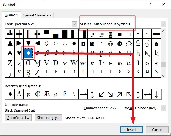 - The symbol dialog box will appear. In the subset drop-down list, select miscellaneous symbols to display symbols in this category which includes the diamond symbol.