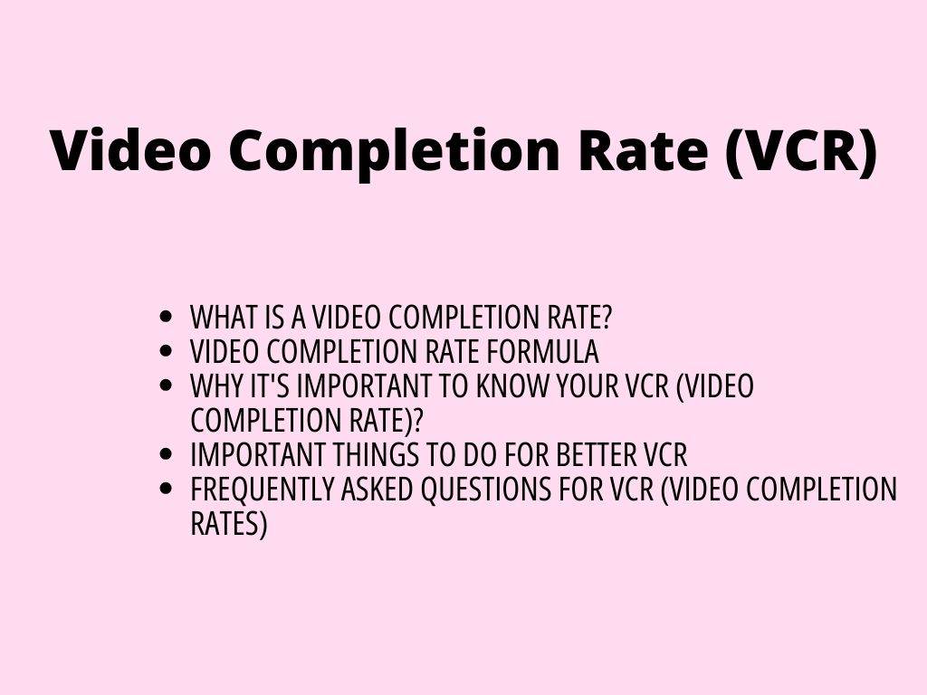 A Video Completion Rate, or VCR, shows the percentage of people who watch your video ads all the way to the end. Advertisers often use this number to see how successful their video ads are.