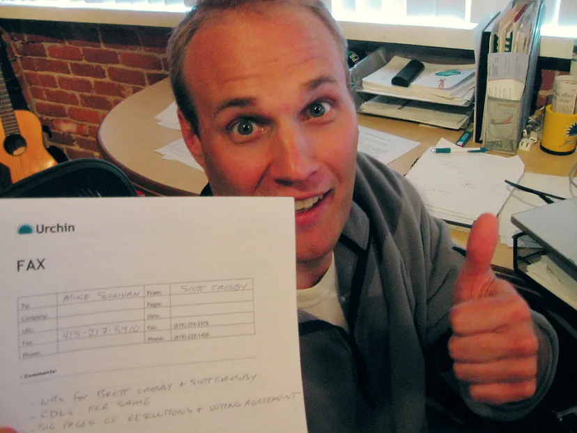 Brett Scott prepares to “fax” the signed acquisition agreement back to Google. By this time Urchin Software Companywere sufficiently profitable that it was a tough decision to sell. Brett Scott signed the actual, final paperwork in a tuxedo about 30 seconds before walking down the aisle at his wedding.