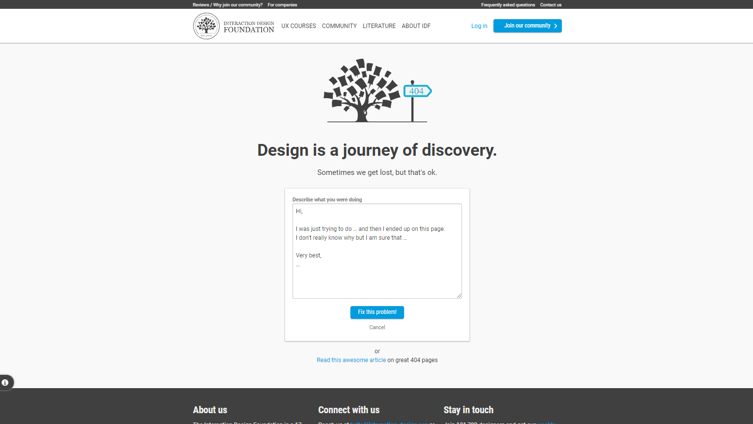 - Fun and friendly text – you can add text to make the situation a little “lighter” and lessen the impact of a negative experience. This text should match the overall tone of the site’s communication and be consistent with the copywriting.
