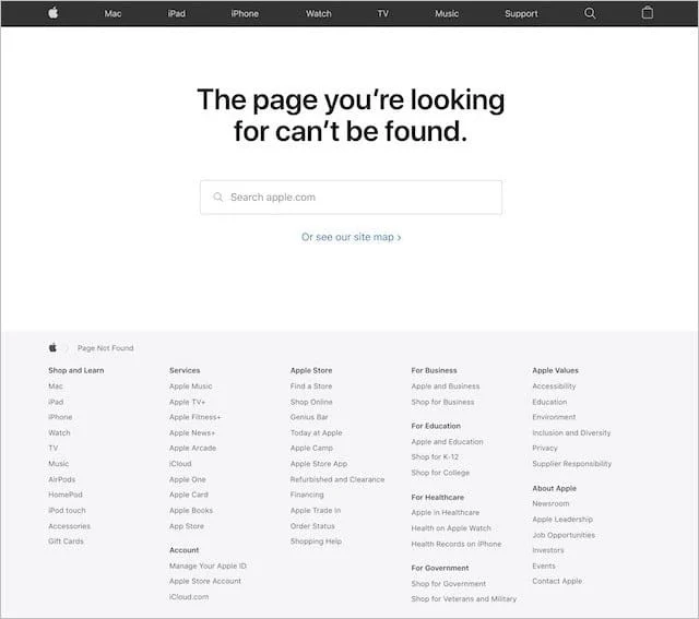 🚀 Apple does this well by keeping their navigation intact on their 404 page, ensuring a seamless experience.