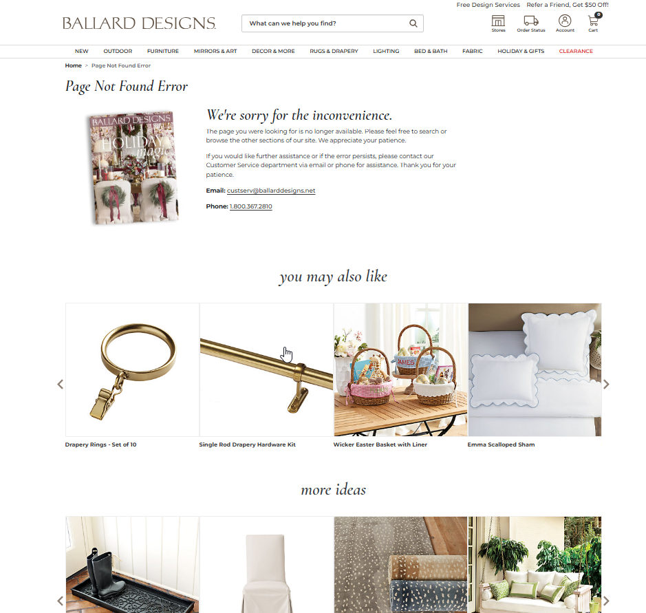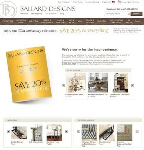 This is how now look like the current version of the 404 page of furniture shop Ballard Designs (we were already shown the older version above with discounts incentives).