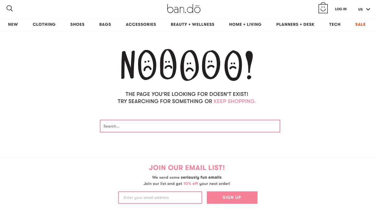 Ban.do includes a fun illustration, a search bar, and an email signup form on their 404 page.