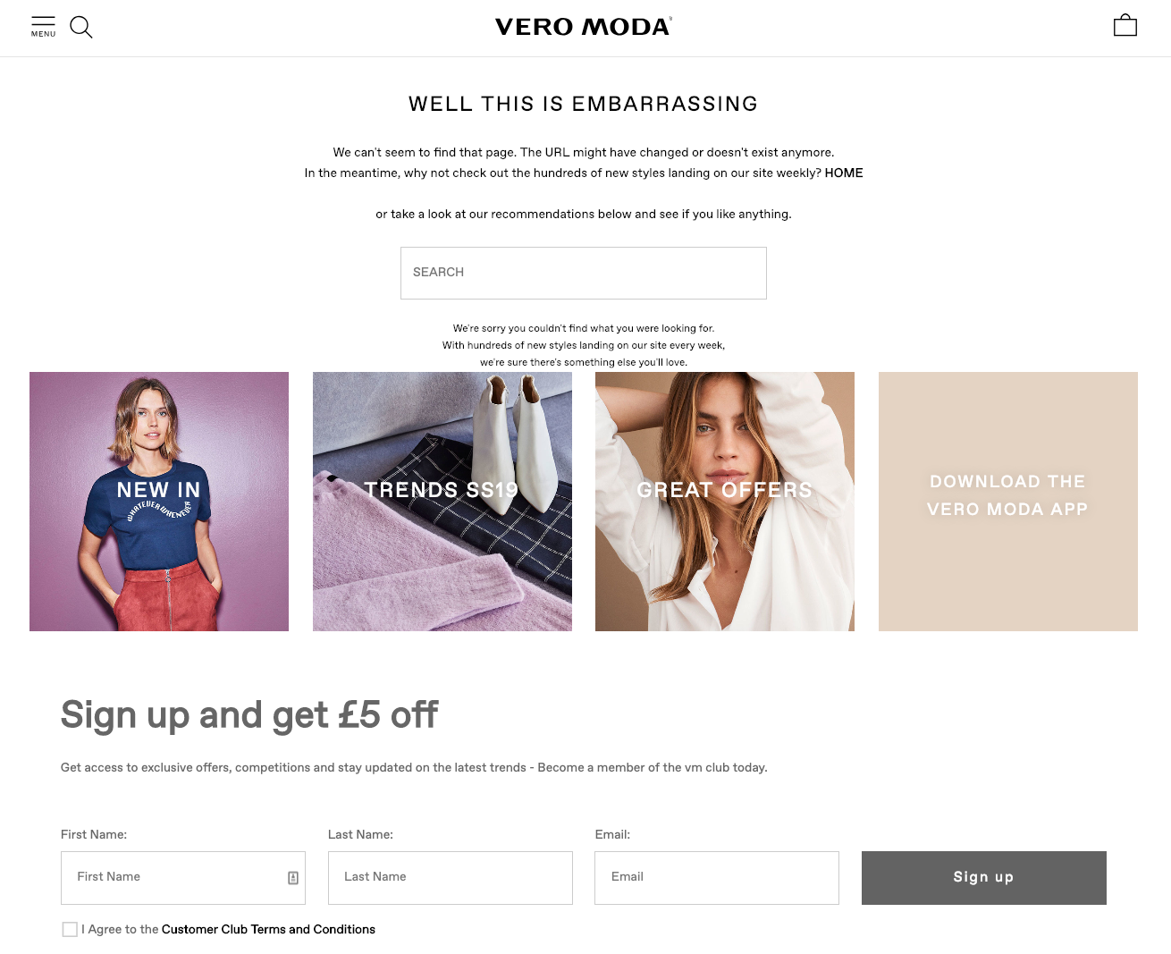 Vero Moda’s 404 page follows a logical flow that enhances user experience:
