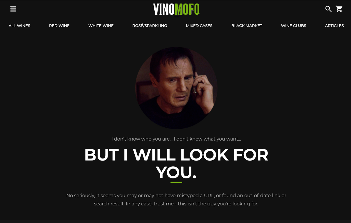 Vinomofo uses Liam Neeson’s famous lines from the movie Taken to create a lighthearted and relatable experience for visitors landing on their 404 page. This approach works well for them because it aligns with their brand’s overall tone and personality.