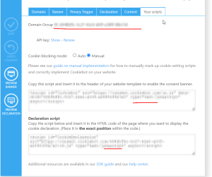 In the “Cookiebot ID” field, copy in the ID from the ‘Your Scripts’ tab under your account on https://manage.cookiebot.com/en/manage (in Your scripts) or you can copy Domain Group ID.