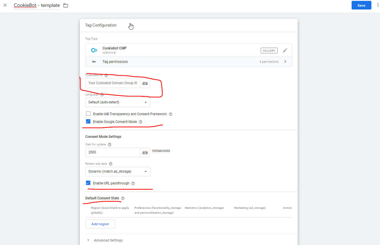 Defining the Google Consent Mode in CookieBot template from GTM gallery