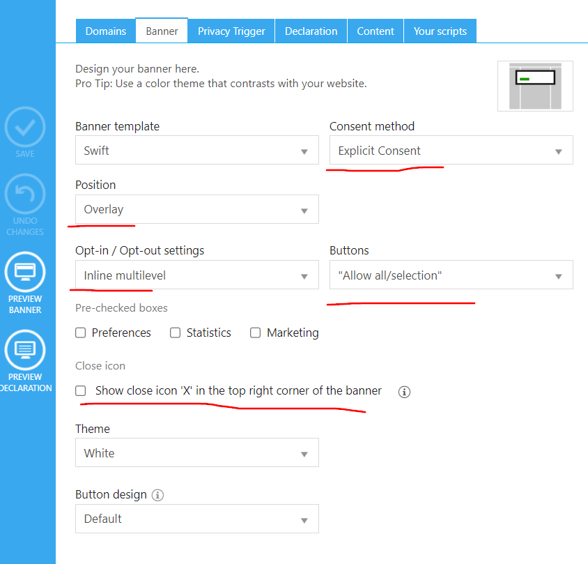 Use position “Overlay” (banner displayed in the center and background is overlayed by filter) and uncheck “Show close icon ‘X’ in the top right corner of the banner” (as then each click outside the area = no cookie consent was given, so you maximize the number of cookies you collect).