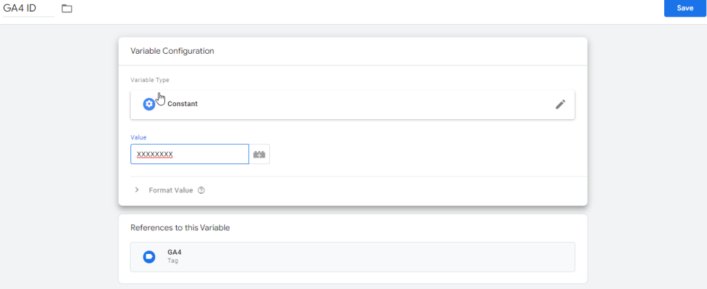 Create GA4 ID variable (Variables – Create New – Constant – insert GA4 ID)