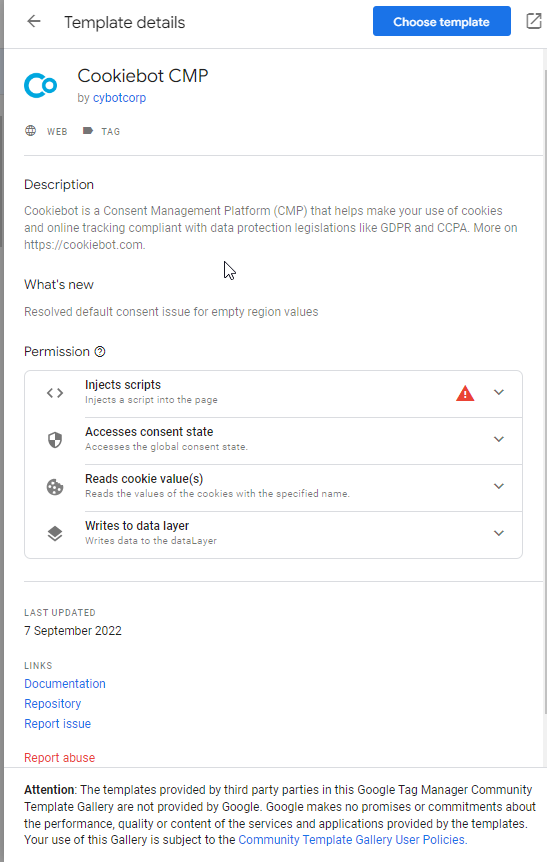 Enter “Cookiebot” in the search field to find the Cookiebot CMPtag template