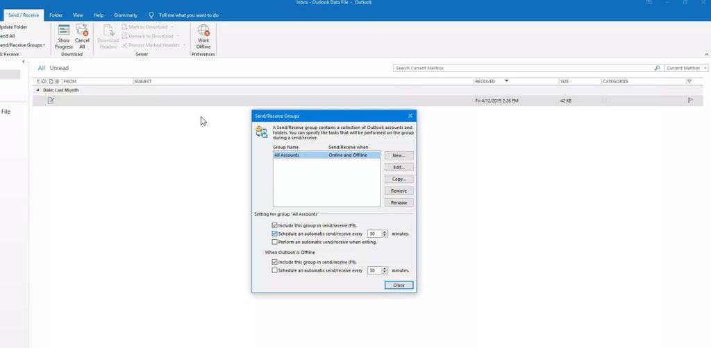 - In the Send/Receive Groups dialog box, highlight All Accounts.