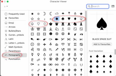 - If you want to insert other symbols with five digits hex code, press “Control + Command + Space bar” keys. This will open the character viewer app and you can search for all playing card symbols in this app to insert on your documents.