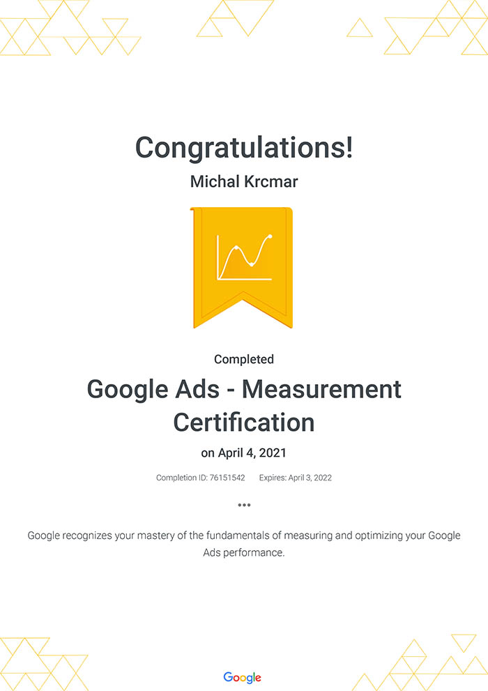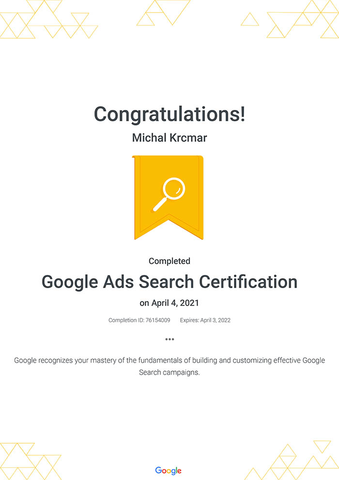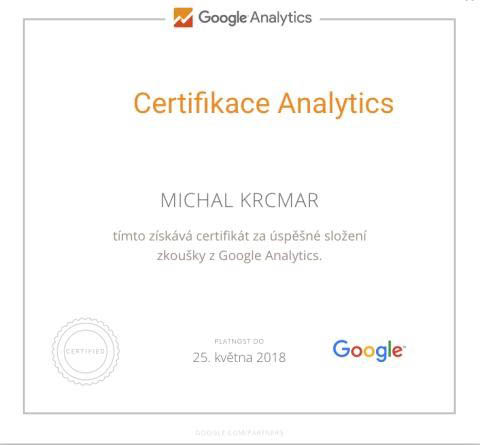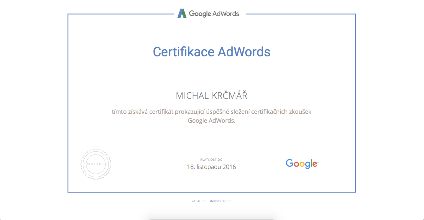 I finaly found out some time to finish online courses for Google Ads Search Certification (ID of the license: 76154009). The certification is valid for 1 year, so next year it is time to do it again :-). I don’t think it is very important, but you know – the repetition is the mother of wisdom.