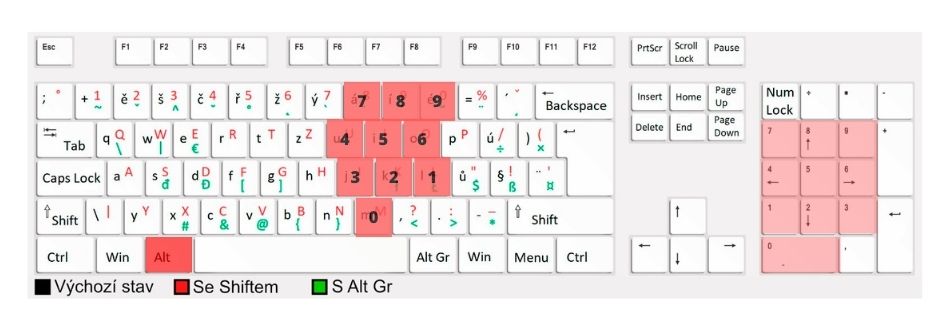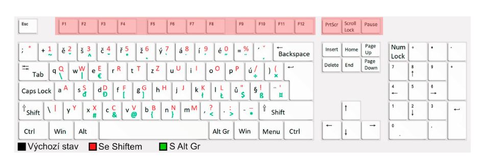 Overview of all keyboard shortcuts for hidden symbols and all functions on the Czech keyboard