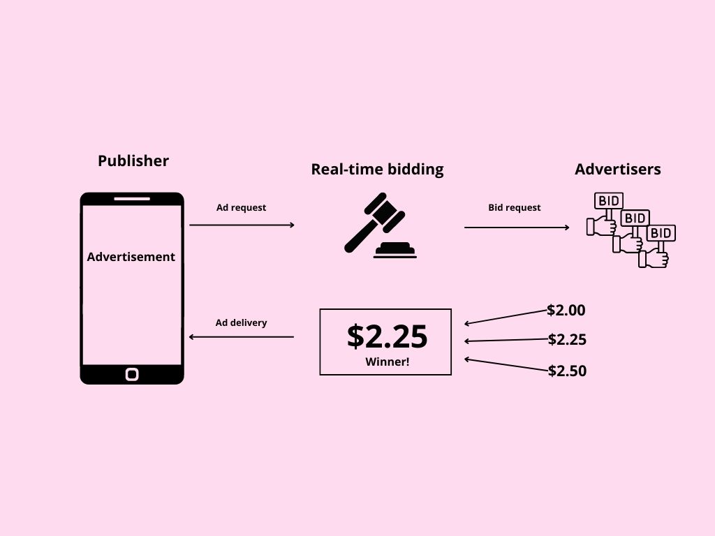 In real-time, multiple advertisers engage in a bidding process for a single impression of a publisher’s inventory. The highest bid, representing the winning ad, is then displayed to the user.