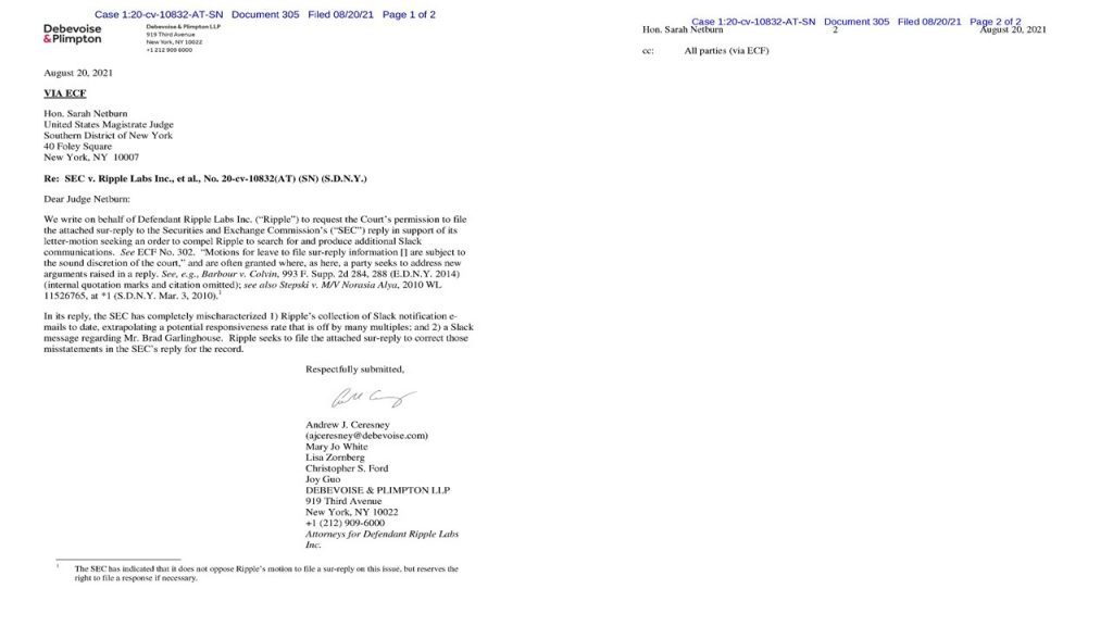 Following the filing of Ripple’s move to extend the time to answer to the SEC’s motion addressing the Slack communications from Thursday, August 12 to Monday, August 16, Ripple requested to extend the deadline to respond to the SEC’s motion to August 16.