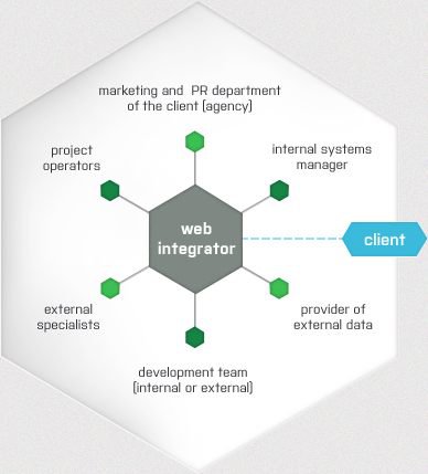 The diagram below depicts the principles of client communication with the web integrator, which is in turn responsible for communication with those in the related fields. In practice, there is direct operational contact between individual experts in various areas.